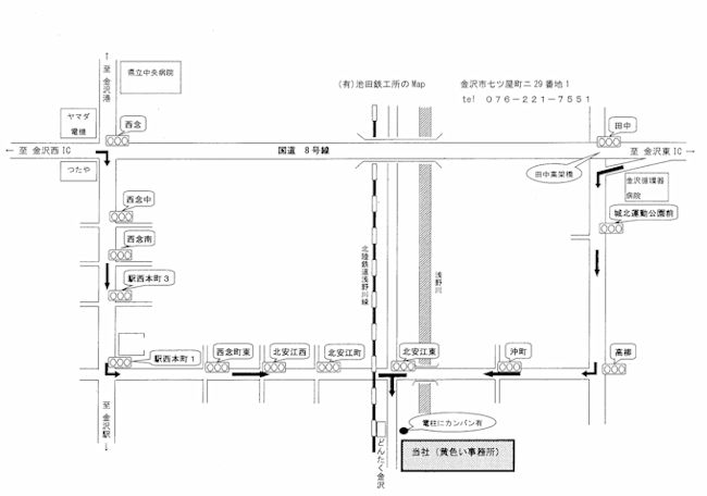 JR金沢駅 兼六園口を出て、左手 信号堀川町を左折 道なりに北へ約10分。